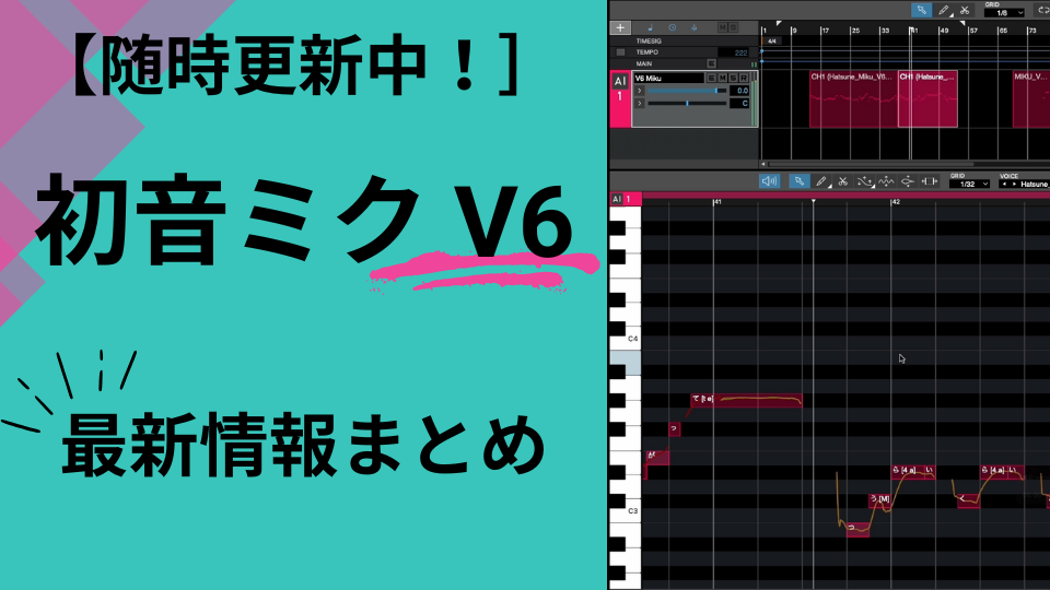 こんにちは、ボカロPの1102です。 この記事は、『初音ミク V6』の最新情報についてまとめた記事になります。 当記事は、以下のサイトの情報をもとに記載しております。 ・SONICWIRE (『初音ミク V6』ティザーページ)・CRYPTON・VOCALOID 以下の動画は『初音ミク V6 Eary Access版』を使用し歌ってもらったものです。 V4X版を使用したフルバージョンはこちら! 『初音ミク V6』 最新情報まとめ 『初音ミク V6』ってなに? 最新のVOCALOIDエンジンである「VOCALOID 6」に対応した初音ミクです。 発売日はいつ? 202...