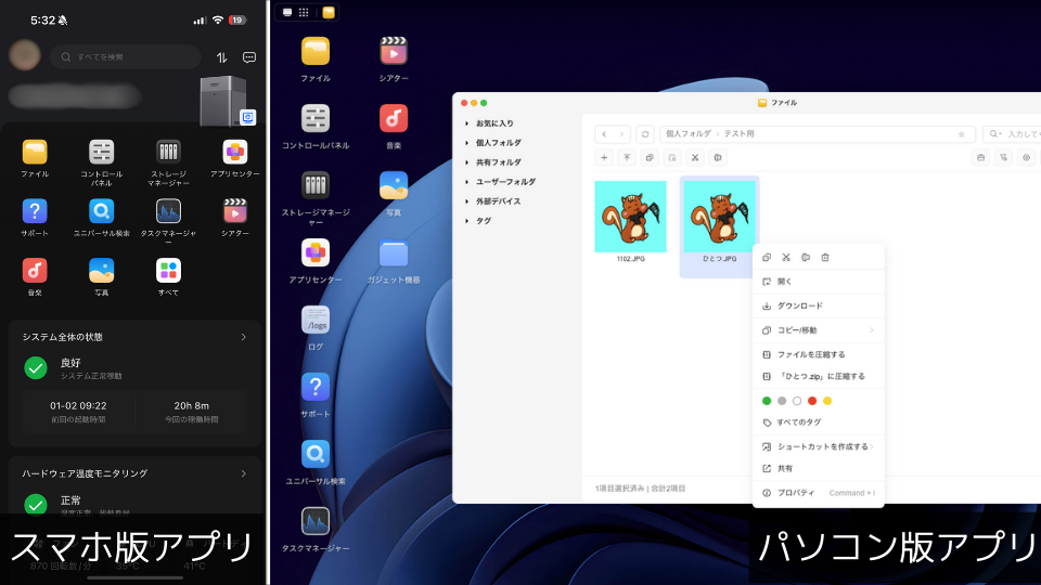 このアプリの操作性が高く、NAS初心者の僕でも設定から操作までをアプリ上で簡単に行うことができました。