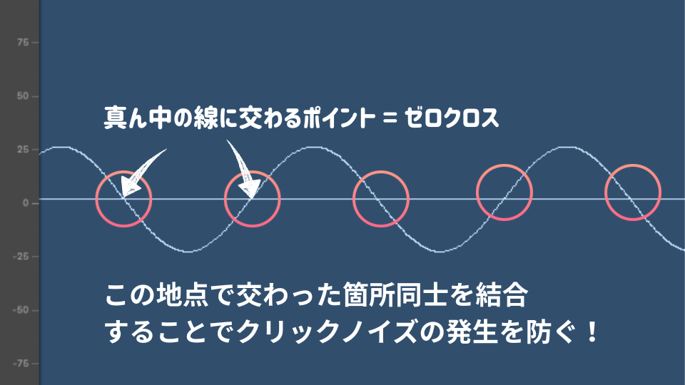 ゼロクロス等でクリックノイズを発生させないように注意しながら、ドライ音を結合。