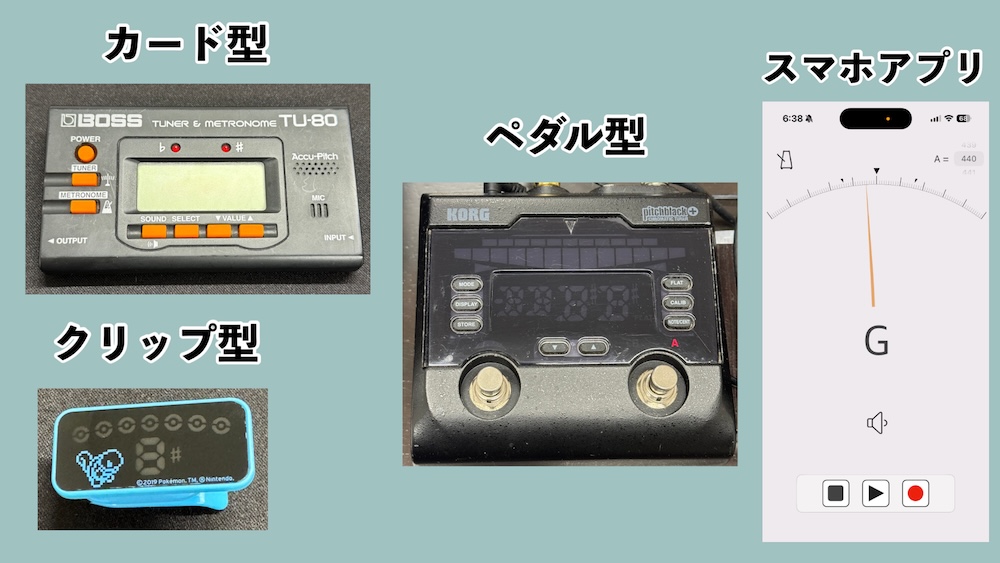 ギターのチューニングには主に以下の4種類のチューナーがあります。各チューナーには特徴や利点、注意点がありますので、自分のスタイルに合ったものを選びましょう。