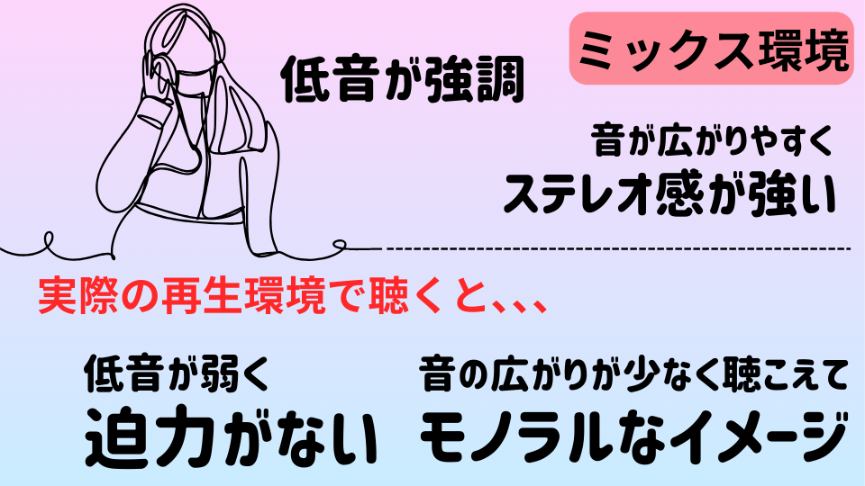 しかし、こういった特徴を持つスピーカーで楽曲制作を行うと、実際に再生環境では以下のように聴こえてしまいます。