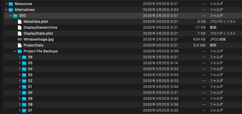 先ほど削除したバックアップは、[パッケージの内容を表示]から[Alternatives > 000 > Project File Backups]で確認できます。