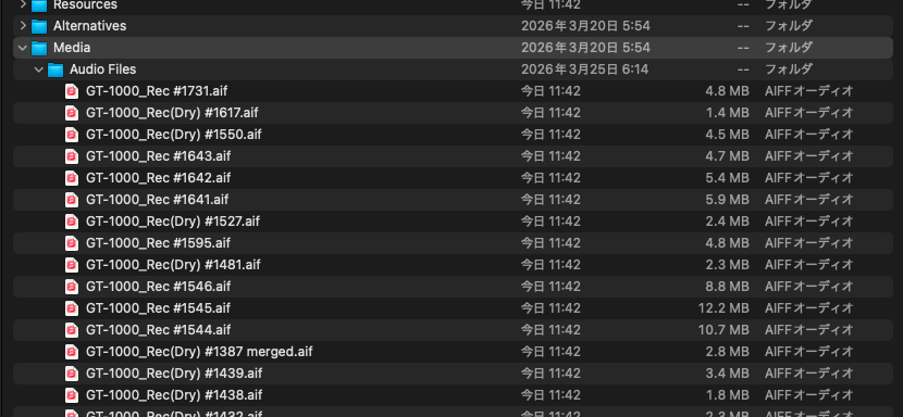 録音したファイルやサンプル等、プロジェクトで使用されたオーディオファイルの保管先は[Audio Files]です。