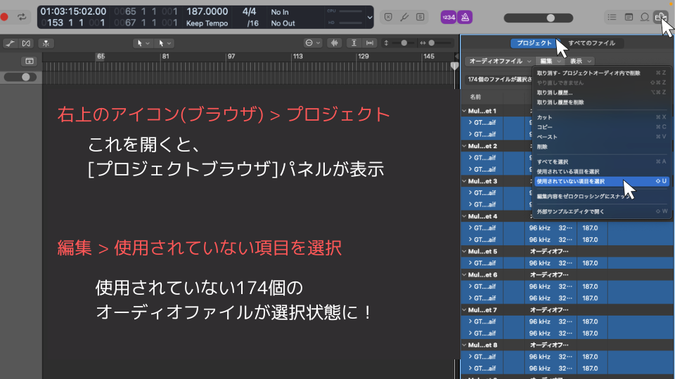 [使用されていない項目を選択]を押すと、「Audio Filesにあるけどトラックでは使用されていないファイル」のみ選択可能です。