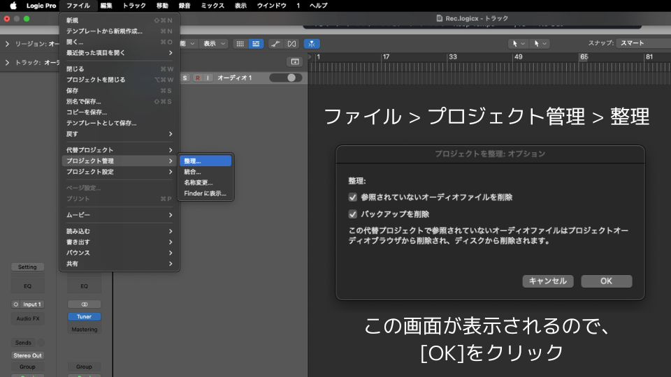 先ほど開いた[プロジェクトを整理]画面を再度開き、[参照されていないオーディオファイルを削除]にチェックを入れてOKを押します。