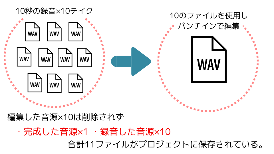 オーディオファイル(主にwav)はMIDIと比べると容量が大きく、プロジェクトファイルを肥大化させる大きな要因です。
