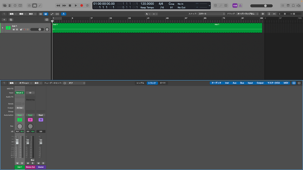 そこでフリーズを実行すると、Logicが裏で対象トラックをオーディオファイルとして書き出し、再生時はそのファイルを流すだけに切り替わります。