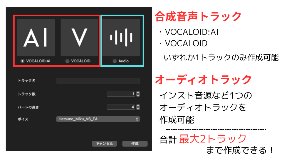 この2トラックは「合成音声トラック1トラック + オーディオトラック1トラック」であり、合成音声ソフトのトラックを2つ作ることはできません。